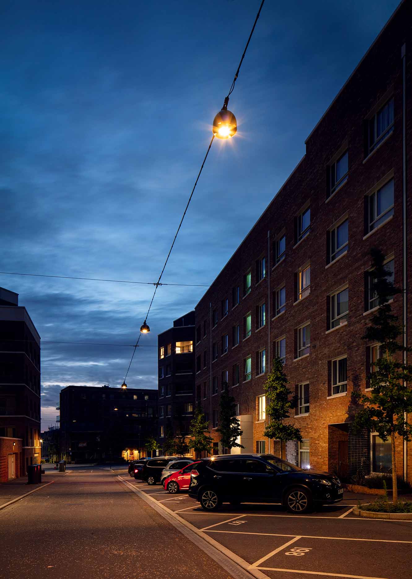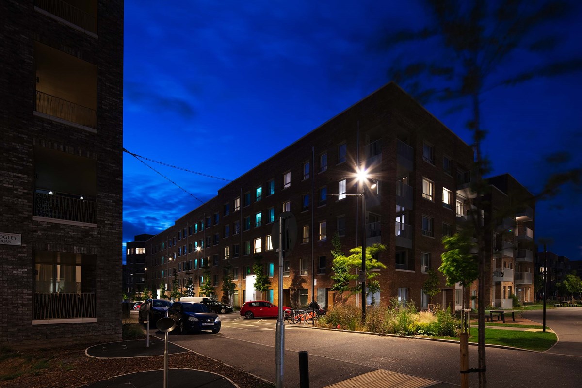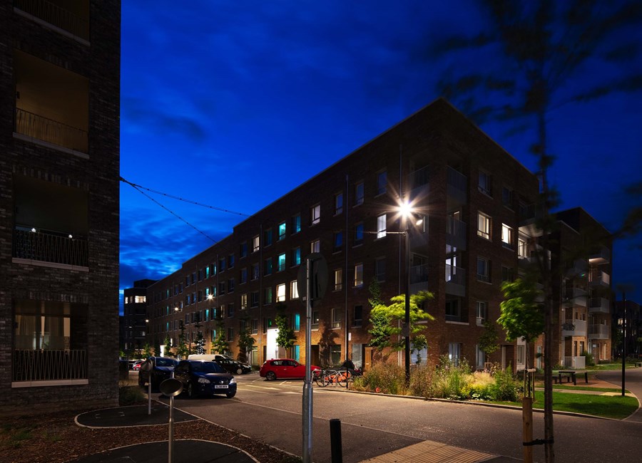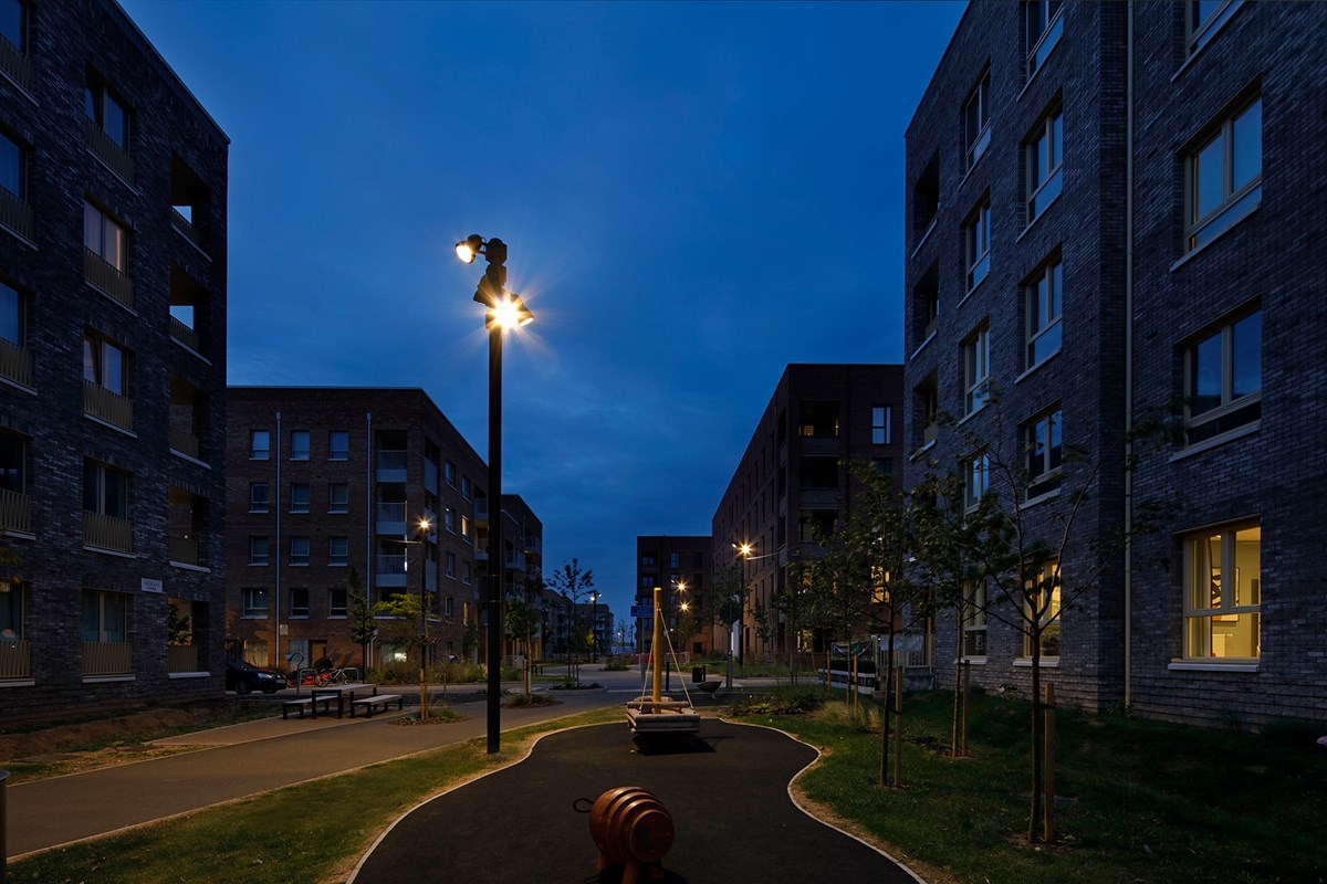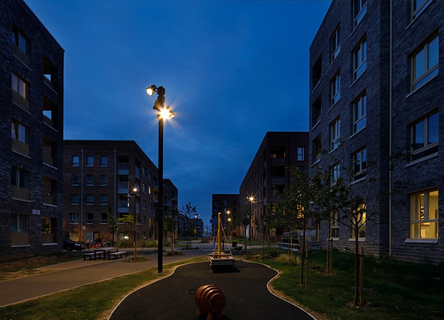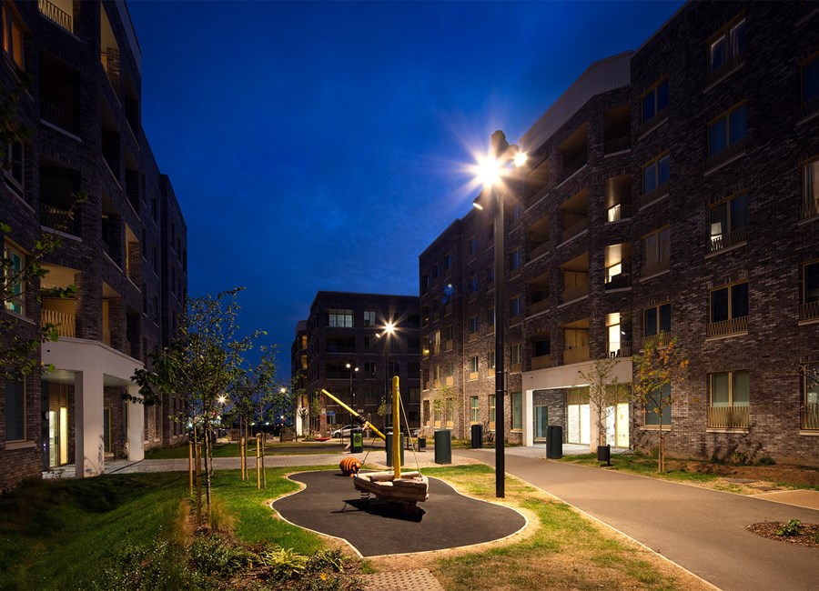 Barking & Riverside is one of East London’s most exciting new developments. Expanding across 443 acres, this large-scale regeneration project will bring over 10,000 new homes to the area. Created with the intention of building a thriving community, the development also features a range of new amenities, including community gardens, local schools, and spaces for new businesses to establish themselves. The ProjectKingfisher Lighting was appointed to deliver the lighting solution for the residential quarter of the Barking & Riverside development. This area features an interconnected network of pedestrian walkways, cycle paths, and a central landscaped garden, all designed to support movement and create welcoming communal spaces for residents. Our role was to provide a lighting scheme that enhanced safety, improved visibility, and maintained a cohesive aesthetic throughout the public realm. By aligning with the overall vision for the development, Kingfisher Lighting helped create an environment that feels both functional and inviting for this growing riverside community. The SolutionDelivered between 2019 and late 2023, this project formed a major part of the public realm infrastructure within the wider masterplan. A substantial and technically demanding catenary system was introduced to create continuous, uniform illumination along pedestrian and cycle routes, supported by column-mounted floodlighting to enhance vertical light and strengthen spatial definition. The scheme utilised PANTHEON 2 floodlights mounted to 8 m root-mounted columns. Across the suspended system, ARTELYS 350 luminaires were specified in a mixture of module outputs and optical distributions, including symmetrical and SO5 street optics, to balance route guidance with visual comfort. A consistent specification was maintained throughout, with warm white 3000K colour temperature, DALI drivers to enable trimming and energy optimisation, and a unified RAL7021 30% gloss finish applied across columns, brackets and luminaires. The completed lighting scheme delivers excellent horizontal and vertical visibility, improving safety, confidence and wayfinding for residents and visitors alike. Key Outcomes