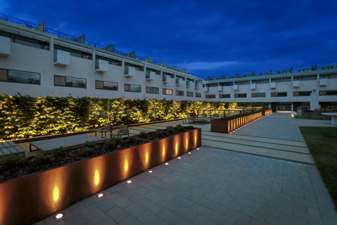 The practical and elegant TITO was used to light foliage around the garden square and the FILA provides uplighting to the light wells and downlighting to the entrance sign. The TULA fitting provided the wall mounted pathway lighting solution.